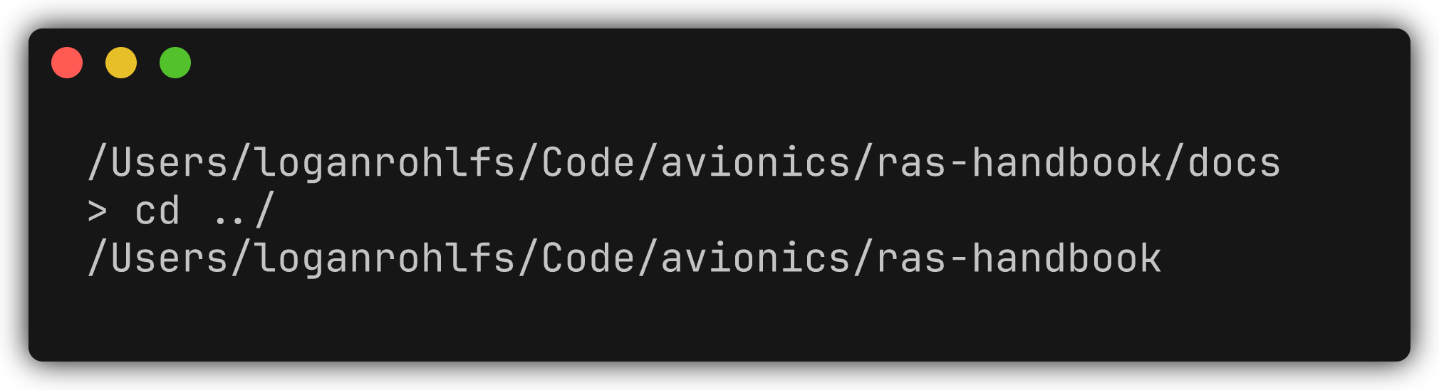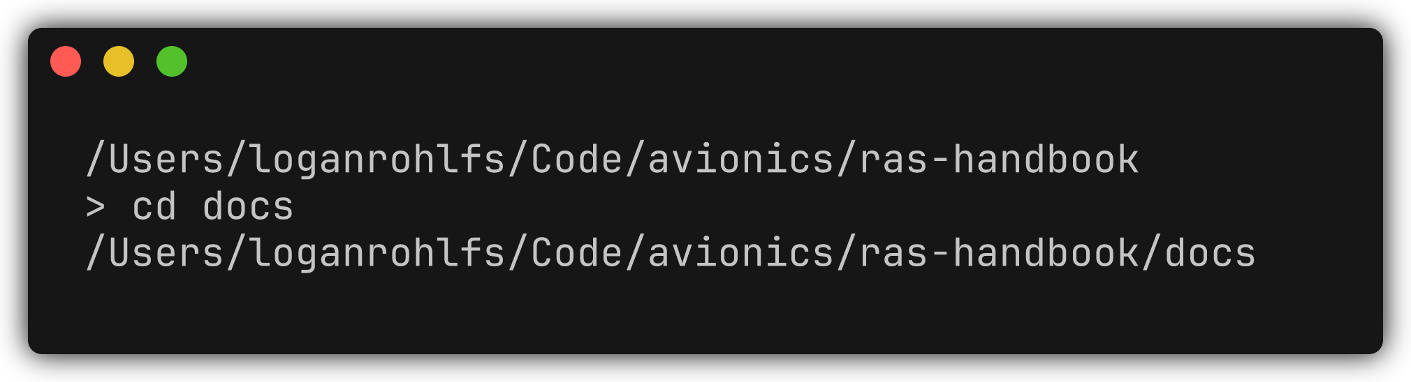 pwd # Output present working directory cd docs # Change working directory pwd # Output present working directory -